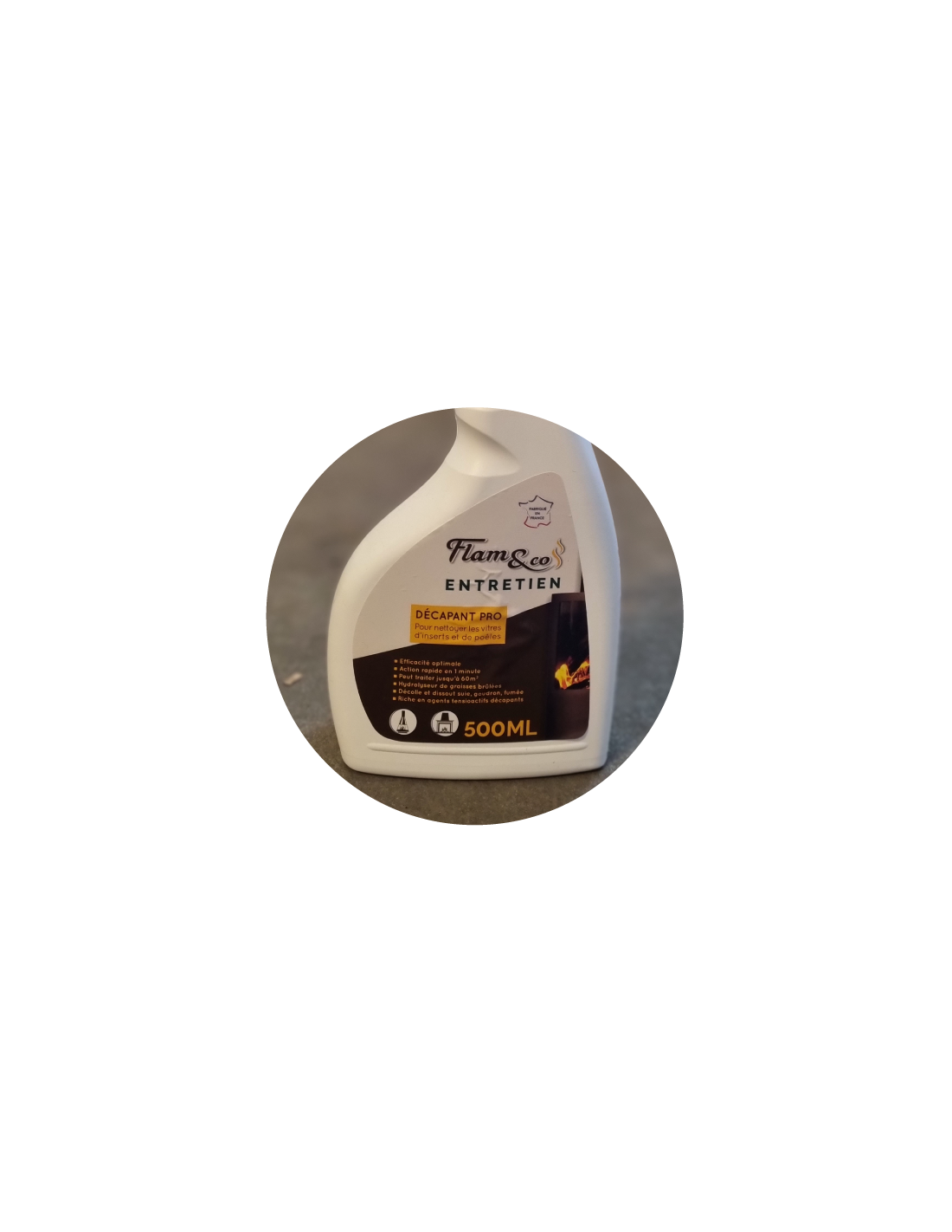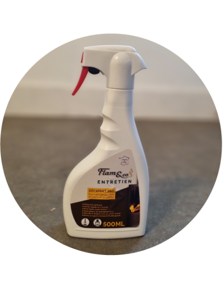 Flam & Co nettoyant décapant pro. Le produit parfait pour l'entretien de votre vitre d'insert ou de votre poêle.